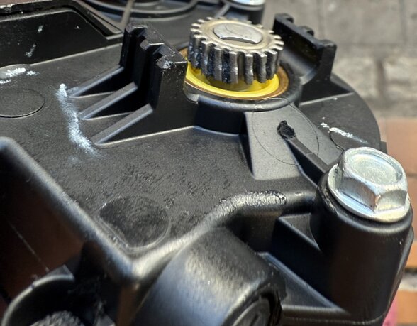 Durch eine Überlastung (sehr oft Aufgrund einer schwergängigen Mechanik) rutscht das Antriebskabel (Steuerseil) einer Mechanikseite am Ritzel des Antriebsmotors über. Dadurch werden in der Regel die Zähne des Ritzel beschädigt (siehe Fotos rechts).
